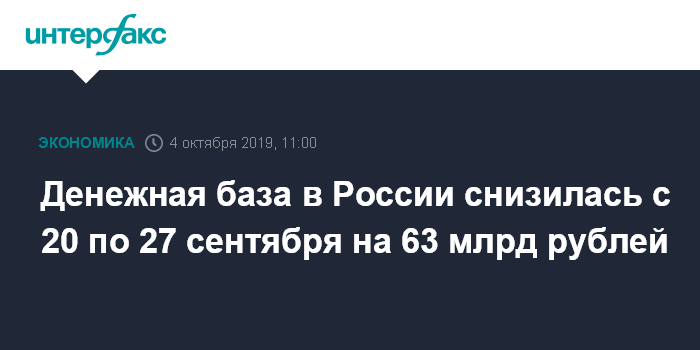 На 20 сентября денежная база в России равнялась 10625,4 млрд рублей. Таким образом, за период она снизилась на 0,59%, или на 63 млрд рублей.