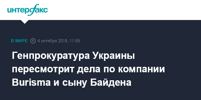 Москва. 4 октября. INTERFAX.RU - Генеральная прокуратура Украины пересматривает около 15 дел, касающихся компании Burisma ("Бурисма"), в том числе эпизод, в котором фигурирует сын экс-вице-президента США Джо Байдена Хантер, занимавший в свое время пост в совете директоров украинской газовой компании, сообщил генеральный прокурор Руслан Рябошапка.