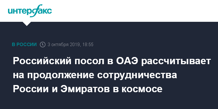 Москва. 3 октября. INTERFAX.RU - Полёт первого астронавта Объединённых Арабских Эмиратов Хаззаы Аль-Мансури стал первым шагом в сотрудничестве России и ОАЭ в космосе, заявил посол РФ в ОАЭ Сергей Кузнецов.