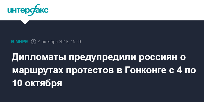 Москва. 4 октября. INTERFAX.RU - Генконсульство России в Гонконге предупредило сограждан о новых массовых протестах, которые планируются с 4 по 7 октября и 10 октября, и указало их маршруты. Дипмиссия сослалась на данные из соцсетей.