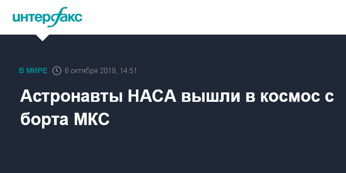 Москва. 6 октября. INTERFAX.RU - Американские астронавты в воскресенье вышли в открытый космос с борта Международной космической станции (МКС) для установки нового комплекта аккумуляторов для ее солнечных панелей, сообщило Национальное управление США по аэронавтике и исследованию космического пространства (НАСА).