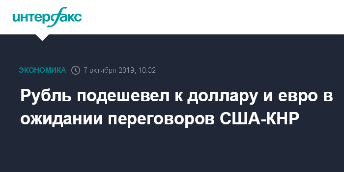 Москва. 7 октября. INTERFAX.RU - Доллар и евро растут на Московской бирже в понедельник утром, рубль дешевеет к бивалютной корзине в ожидании новостей относительно торговых переговоров между США и Китаем, запланированных на вторую половину недели.