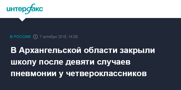 Москва. 7 октября. INTERFAX.RU - В Новодвинске Архангельской области школу №7 закрыли на карантин после того, как девять учеников четвертого класса заболели внебольничной микоплазменной пневмонией. Об этом сообщила пресс-служба областного правительства.