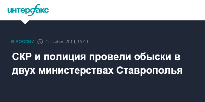 Москва. 7 октября. INTERFAX.RU - Сотрудники Следственного комитета РФ (СКР) и МВД провели в понедельник обыски в министерстве строительства и архитектуры, а также в министерстве физической культуры Ставропольского края, сообщает пресс-служба следственного управления СКР по региону в понедельник.