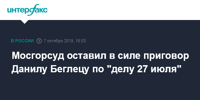 Мосгорсуд оставил в силе приговор Данилу Беглецу по "делу 27 июля"