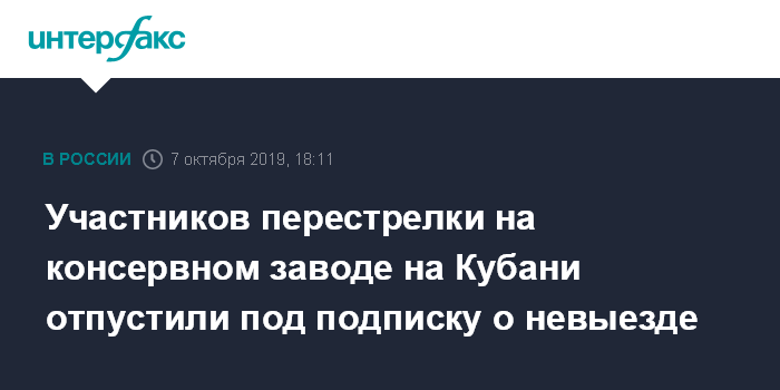 Москва. 7 октября. INTERFAX.RU - Фигурантам уголовного дела о перестрелке на консервном заводе в Славянске-на-Кубани избрана мера пресечения в виде подписки о невыезде. Об этом сообщили агентству "Интерфакс" в пресс-службе ГУ МВД по Краснодарскому краю в понедельник.