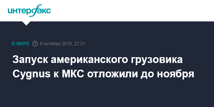 Москва. 8 октября. INTERFAX.RU - Отправка очередного американского грузового космического корабля Cygnus к Международной космической станции (МКС) перенесена на ноябрь, сообщило во вторник Национальное управление США по аэронавтике и исследованию космического пространства (NASA).