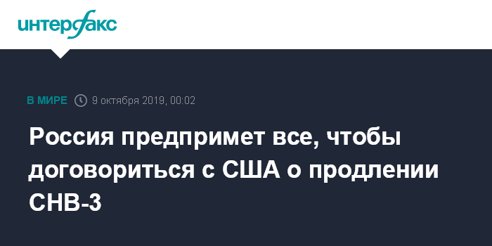 Москва. 8 октября. INTERFAX.RU - Россия продолжит предпринимать усилия, чтобы продлить действие истекающего в 2021 году договора СНВ-3, заявил директор департамента по вопросам нераспространения и контроля над вооружениями МИД РФ Владимир Ермаков.