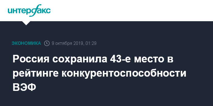 Москва. 9 октября. INTERFAX.RU - Россия в 2019 году осталась на 43-м месте среди 141 страны в рейтинге по индексу глобальной конкурентоспособности, который ежегодно составляет Всемирный экономический форум (ВЭФ, World Economic Forum, WEF).