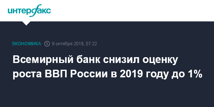 Москва. 9 октября. INTERFAX.RU - Всемирный банк понизил свой июньский прогноз роста экономики РФ в 2019 году до 1% с 1,2%. Такая оценка содержится в докладе "Всемирный банк: Отчет об экономике региона Европы и Центральной Азии - октябрь 2019", опубликованном в среду.