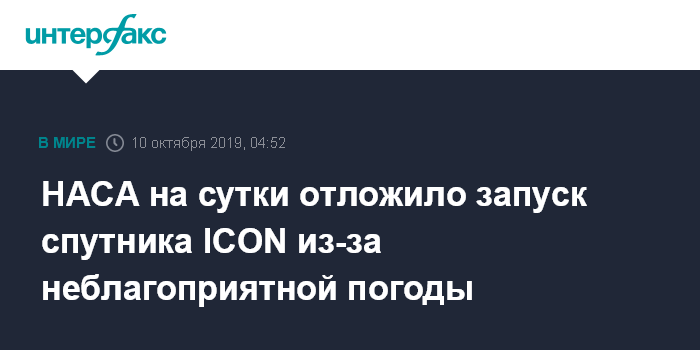 Москва. 10 октября. INTERFAX.RU - Запуск спутника ICON, предназначенного для изучения земной ионосферы, перенесен на сутки в связи с неблагоприятной погодой в районе мыса Канаверал, сообщило Национальное управление США по аэронавтике и исследованию космического пространства (НАСА).