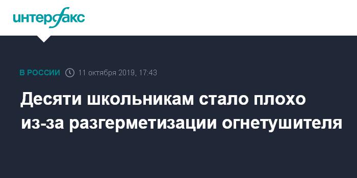Москва. 11 октября. INTERFAX.RU - В одной из школ в Горячем ключе двое детей уронили порошковый огнетушитель в классе, произошла разгерметизация. Десять детей почувствовали себя плохо и их отвезли в больницу, сообщил "Интерфаксу" информированный источник.