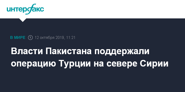 Москва. 12 октября. INTERFAX.RU - Правительство Пакистана выражает поддержку операции Турции "Источник мира", проходящей на северо-востоке Сирии, сообщают в субботу западные СМИ со ссылкой на заявление администрации пакистанского премьер-министра Имран Хана.