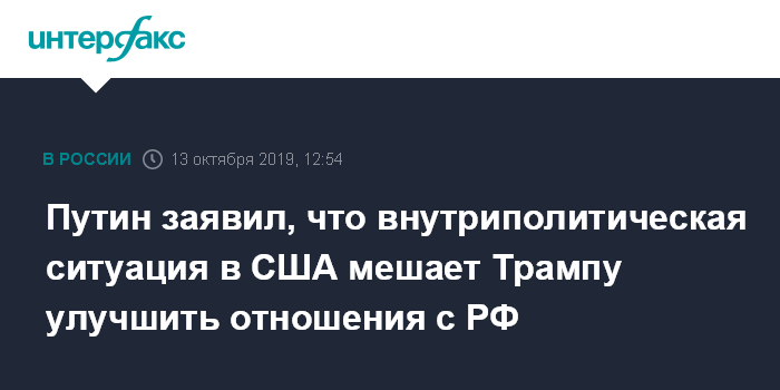 Москва. 13 октября. INTERFAX.RU - Внутриполитическая ситуация в США не позволяет президенту этой страны Дональду Трампу кардинально улучшить отношения с Россией, полагает президент РФ Владимир Путин.