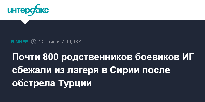 Москва. 13 октября. INTERFAX.RU - 785 членов семей боевиков ИГ (террористическая группировка, запрещена в РФ) в воскресенье смогли бежать из заключения после того, как их лагерь подвергся обстрелу турецкой артиллерии, сообщает британский телеканал Sky news со ссылкой на источники в сирийской оппозиции.