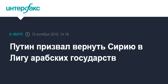 Москва. 13 октября. INTERFAX.RU - Президент РФ Владимир Путин высказался за возвращение Сирии в Лигу арабских государств.