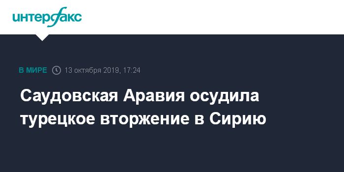 Москва. 13 октября. INTERFAX.RU - Саудовская Аравия осуждает турецкую военную операцию "Источник мира" против курдских боевиков и террористов, начавшуюся 9 октября в Сирии в приграничных районах на северо-востоке Сирии. Об этом заявил журналистам государственный министр королевства по иностранным делам Адель аль-Джубейр.