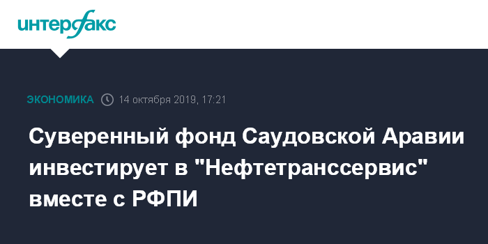 Москва. 14 октября. INTERFAX.RU - Суверенный фонд Королевства Саудовская Аравия Public Investment Fund (PIF) присоединился к пулу инвесторов компании "Нефтетранссервис" (НТС), входящей в число крупнейших российских операторов железнодорожного подвижного состава. Об этом сообщил Российский фонд прямых инвестиций (РФПИ).