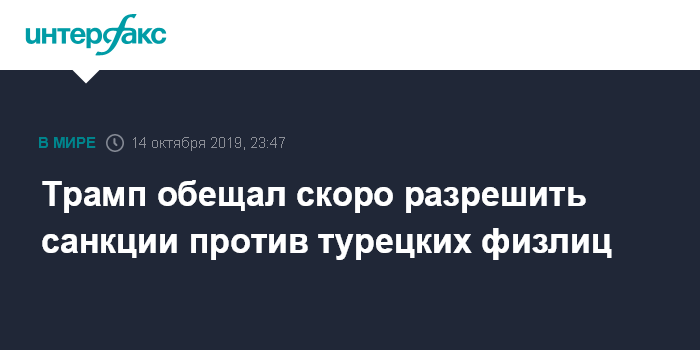 "США будут агрессивно использовать экономические санкции против тех, кто причастен или финансирует ужасающие действия (Турции - ИФ) в Сирии. Я полностью готов быстро разрушить экономику Турции, если ее лидеры продолжат идти по опасному и деструктивному пути", - подчеркнул он в заявлении.