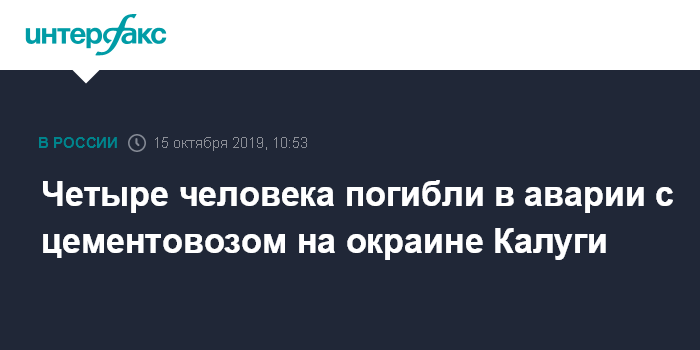 Москва. 15 октября. INTERFAX.RU - Три автомобиля, в том числе цементовоз, столкнулись утром во вторник на дороге, соединяющей Калугу и трассу М3 "Украина", погибли четверо. Об этом сообщила пресс-служба областного управления МВД.