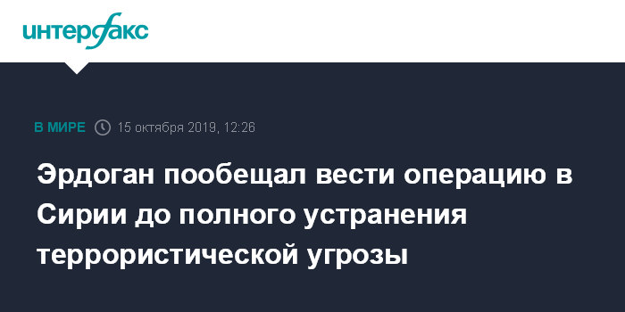 Москва. 15 октября. INTERFAX.RU - Турция проводит военную операцию в Сирии против террористов согласно плану, представленному в Совет безопасности ООН, и будет продолжать боевые действия до полной ликвидации террористической угрозы, заявил президент Реджеп Тайип Эрдоган.