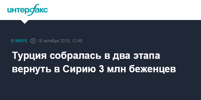 Москва. 15 октября. INTERFAX.RU - Турция на первом этапе вернет в Сирию 1 млн беженцев, на втором этапе - еще 2 млн человек, сообщил президент Турции Реджеп Тайип Эрдоган.