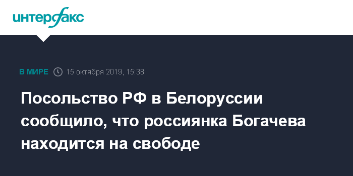 Москва. 15 октября. INTERFAX.RU - Посольство РФ в Белоруссии сообщило, что россиянка Анна Богачева, о задержании которой сообщалось ранее во вторник, находится на свободе.