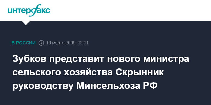 Зубков представит нового министра сельского хозяйства Скрынник руководству Минсельхоза РФ