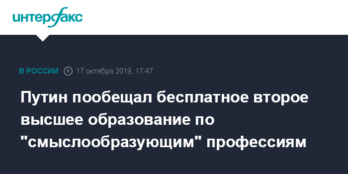 Москва. 17 октября. INTERFAX.RU - Президент России Владимир Путин считает возможным сделать бесплатным получение второго высшего образования для учебных заведений, которые готовят режиссеров, сценаристов, специалистов "смыслообразующих профессий".