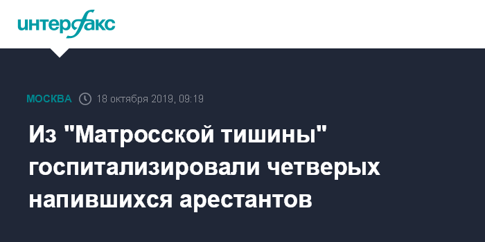 Москва. 18 октября. INTERFAX.RU - Четверо заключенных московского следственного изолятора "Матросская тишина" (СИЗО-1) госпитализированы с признаками сильного опьянения в городскую больницу, сообщил представитель столичного управления Федеральной службы исполнения наказаний (ФСИН) Сергей Цыганков.