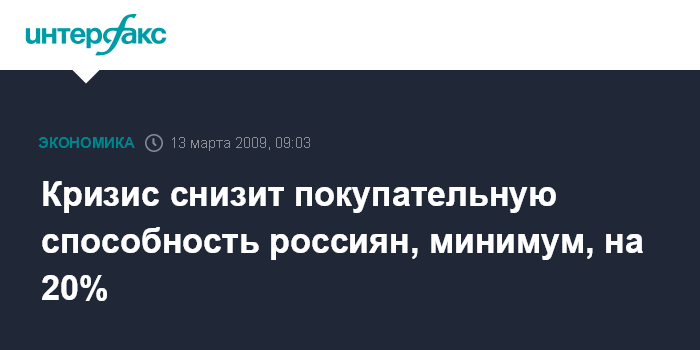 "Из-за финансового кризиса к концу текущего года покупательная способность россиян станет меньше на 20% по сравнению с концом 2008 года. И это самый благополучный и оптимистичный сценарий развития ситуации", - заявил Д.Янин "Интерфаксу".