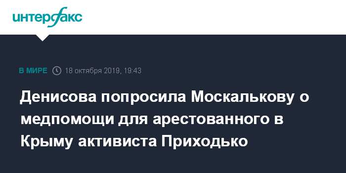 Москва. 18 октября. INTERFAX.RU - Уполномоченный Верховной Рады Украины по правам человека Людмила Денисова просит российскую коллегу Татьяну Москалькову принять срочные меры по предоставлению медицинской помощи осужденному в Крыму проукраинскому активисту Олегу Приходько.