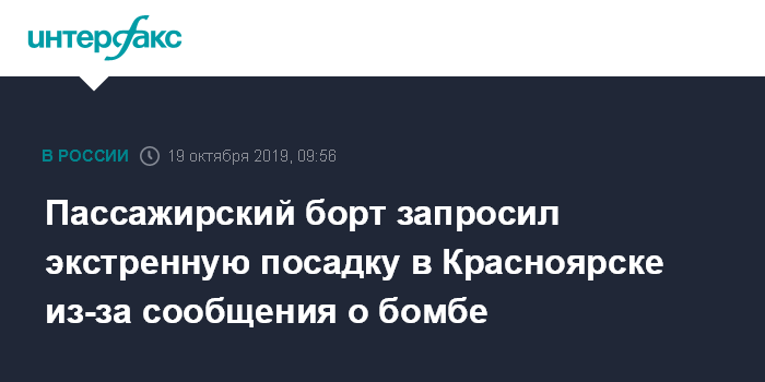 Москва. 19 октября. INTERFAX.RU - Пассажирский лайнер "Норд-авиа" запросил экстренную посадку в Красноярске из-за анонимного сообщения о бомбе на борту.
