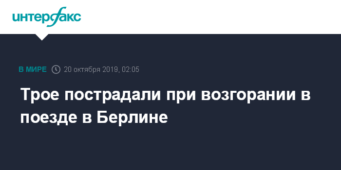 Москва. 20 октября. INTERFAX.RU - Три человека пострадали в результате возгорания вагона поезда дальнего следования в Берлине, сообщает пожарная служба города в твиттере.