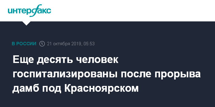 Москва. 21 октября. INTERFAX.RU - Количество пострадавших от последствий разрушения пяти дамб в Красноярском крае увеличилось до 26, еще десять человек были госпитализированы после обращения к медикам, сообщили агентству "Интерфакс" в пресс-службе регионального Минздрава.