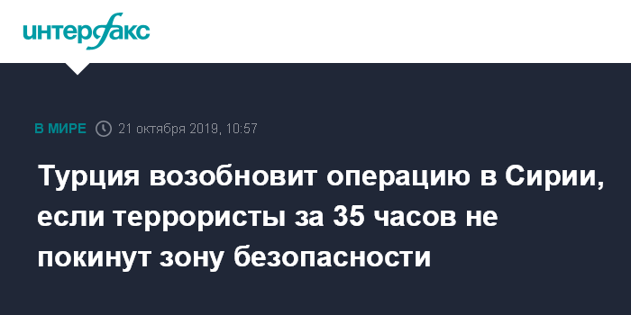 Турция возобновит операцию в Сирии, если террористы за 35 часов не покинут зону безопасности