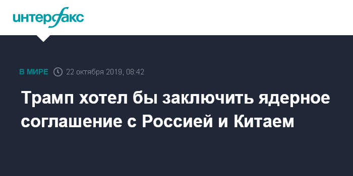"Китай и Россия, с которыми мы обсуждаем это (соглашение о ядерном оружии - ИФ), заинтересованы в этом 100%. Нам всем необходимо соглашение. (...) Я думаю, что Россия хотела бы заключить сделку, и я думаю, что Китай хотел бы заключить сделку, которая станет потрясающей, я хотел бы быть частью этого", - сказал Трамп в интервью Fox News.