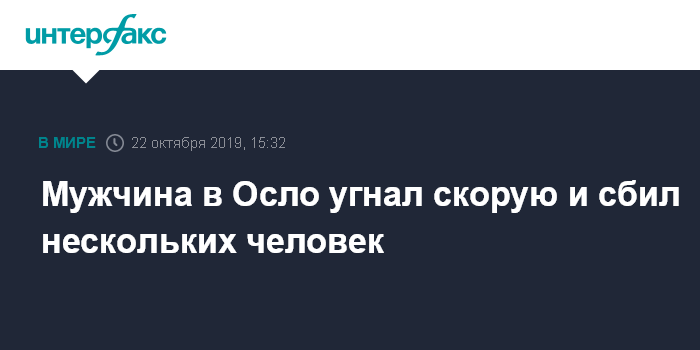 Москва. 22 октября. INTERFAX.RU - Норвежские полицейские открыли огонь и ранили человека, который захватил и угнал карету скорой помощи в северной части Осло и совершил на этом автомобиле наезд на нескольких человек, информирует норвежская телерадиокомпания NRK.