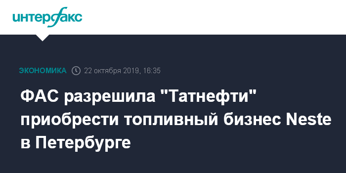 ФАС разрешила "Татнефти" приобрести топливный бизнес Neste в Петербурге