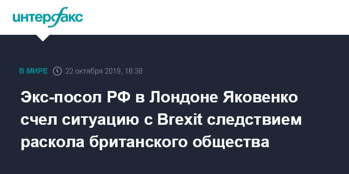 Москва. 22 октября. INTERFAX.RU - Ситуация с Brexit является следствием раскола в британском обществе и попыток переложить ответственность за происходящее на политических оппонентов, заявил "Интерфаксу" бывший посол РФ в Великобритании Александр Яковенко.