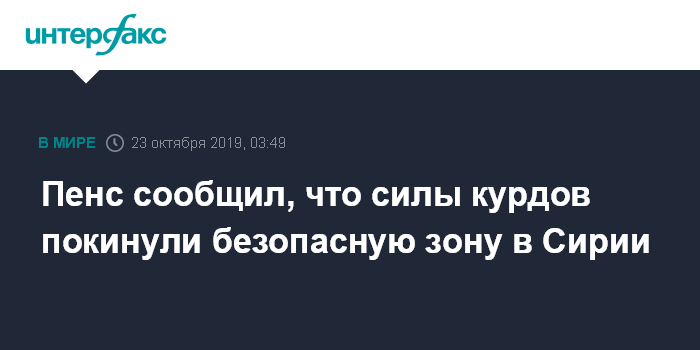 Москва. 23 октября. INTERFAX.RU - Вице-президент США Майк Пенс заявил, что силы курдов вывели свои войска из зоны безопасности в Сирии.