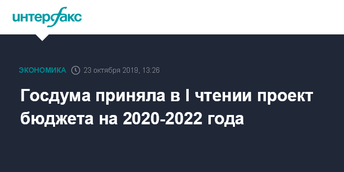 Москва. 23 октября. INTERFAX.RU - Госдума на заседании в среду приняла в первом чтении законопроект о федеральном бюджете на 2020 год и на плановый период 2021 и 2022 годов.