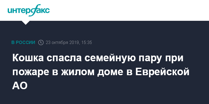 Москва. 23 октября. INTERFAX.RU - В Еврейской автономной области кошка вовремя предупредила хозяев и вспыхнувшем в доме пожаре, что спасло им жизнь, сообщает пресс-служба ГУ МЧС по региону.