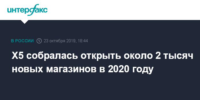 Москва. 23 октября. INTERFAX.RU - X5 Retail Group планирует открыть до 2 тысяч новых магазинов в 2020 году (показатель gross, без учета закрытий), сообщается в презентации компании.