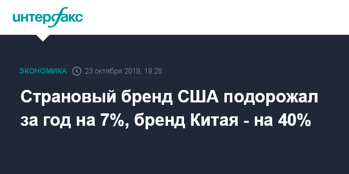 Москва. 23 октября. INTERFAX.RU - Оценка странового бренда США с прошлого года выросла на 7,2%, до $27,751 трлн, оценка бренда Китая взлетела на 40,5%, до $19,486 трлн, бренд ФРГ подешевел на 5,7%, до $4,855 трлн. Таковы результаты исследования Brand Finance.