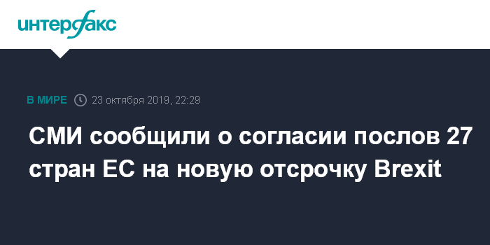 Москва. 23 октября. INTERFAX.RU - Страны-участницы Европейского Союза в среду согласились с необходимостью очередной отсрочки выхода Британии из союза, но пока не утвердили новую дату, на которую переносится Brexit, сообщает The Guardian.