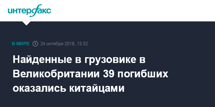 Москва. 24 октября. INTERFAX.RU - 38 взрослых и один подросток, обнаруженные мертвыми в грузовике в Эссексе, были китайцами, сообщает в четверг BBC News.