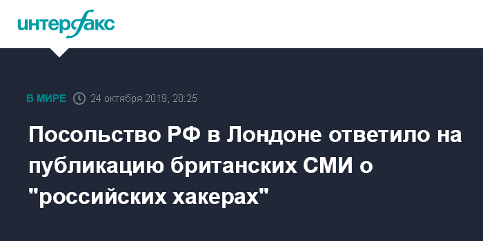 Москва. 24 октября. INTERFAX.RU - В посольстве России в Лондоне назвали публикации в британских СМИ о предполагаемой вредоносной деятельности "российских хакерских группировок" нечистоплотной интерпретацией краткого доклада британских и американских спецслужб.