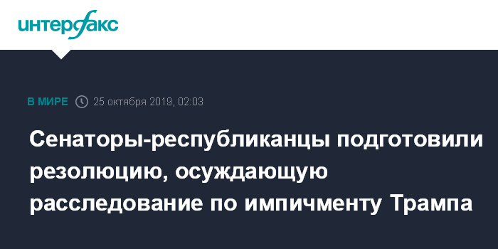 Москва. 25 октября. INTERFAX.RU - Группа республиканцев Сената США вносит на рассмотрение в четверг резолюцию, осуждающую расследование в рамках процедуры импичмента против президента Дональда Трампа и призывающую Палату представителей провести официальное голосование по этому вопросу.