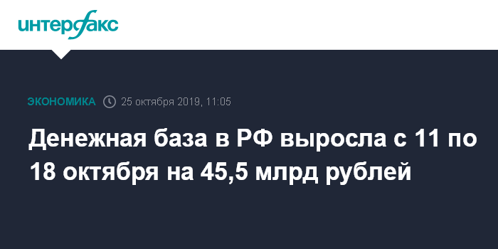 На 11 октября денежная база в России равнялась 10640,4 млрд рублей. Таким образом, за период она выросла на 0,43%, или на 45,5 млрд рублей.